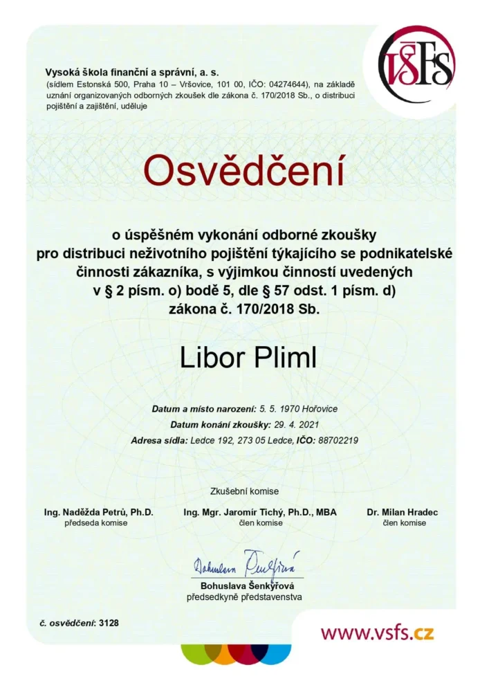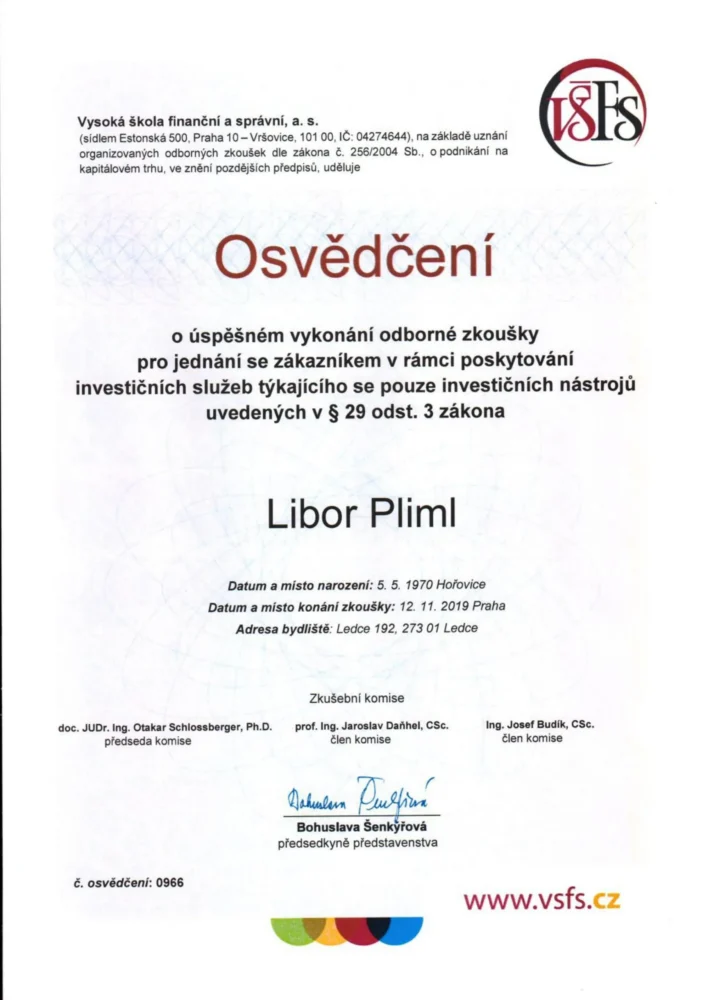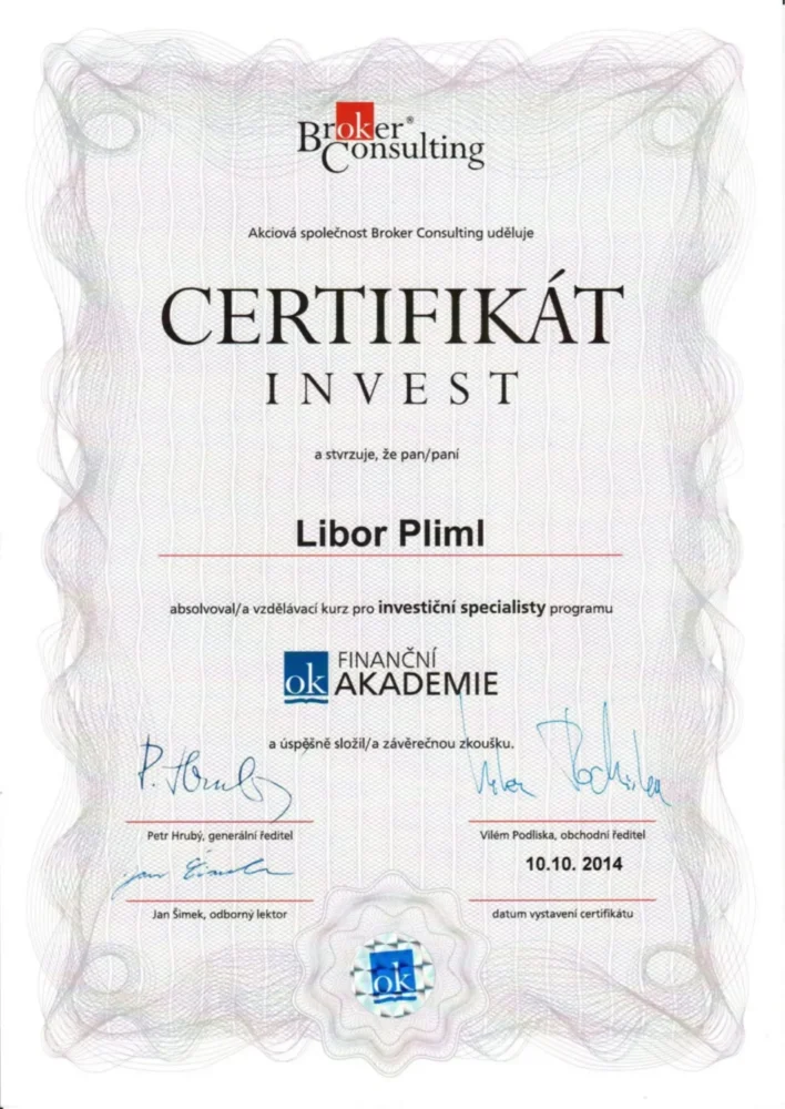 Jsem perfekcionista. Chci poskytovat co nejlepší služby a ze svých vysokých nároků nikdy neslevuji. Proto se průběžně vzdělávám v oboru, který je tak dynamický, že kdo usne na vavřínech a poleví, tomu ujede vlak. Nikdy vám nenabídnu řešení, které bylo nejvýhodnější včera, ale pouze to, které je nejvýhodnější dnes. Tyto certifikáty jsou toho důkazem.