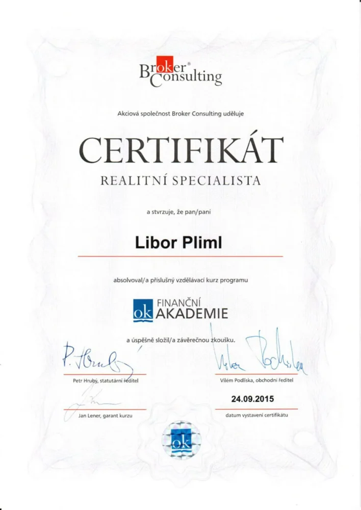 Jmenuji se Libor Pliml, působím jako oblastní ředitel ve společnosti Broker Consulting a už od roku 2012 spolu se svým týmem pomáhám klientům dosáhnout na vlastní bydlení, hledám jim vhodné investiční příležitosti a prostřednictvím finančního plánu je posouvám k opravdové svobodě – finanční nezávislosti.